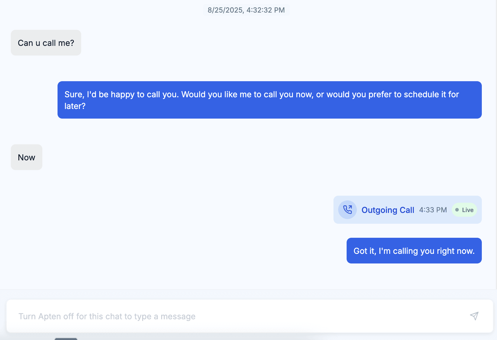 If the AI sends an SMS asking, “Would you like to schedule a consultation tomorrow?” and the customer replies, “Yes,” Apten can later call that lead and say: